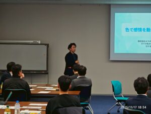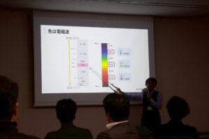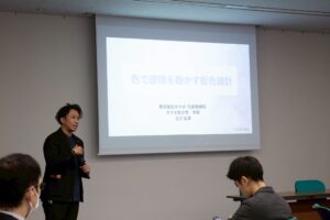 セミナー前半では、「色を利用した感情・行動コントロール」をテーマに、配色が人の心理や行動に与える影響について講義が行われました。